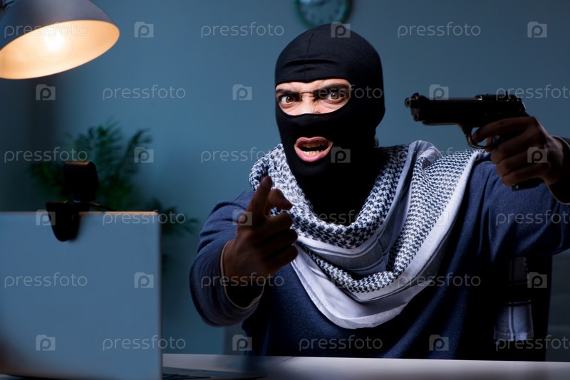 Террористический вор с оружием работает на компьютере