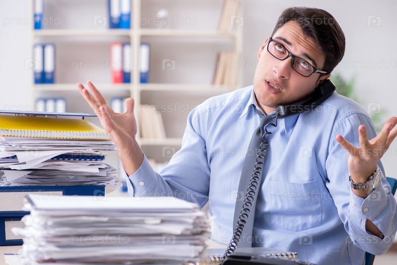Чрезвычайно занятый бизнесмен, работающий в офисе