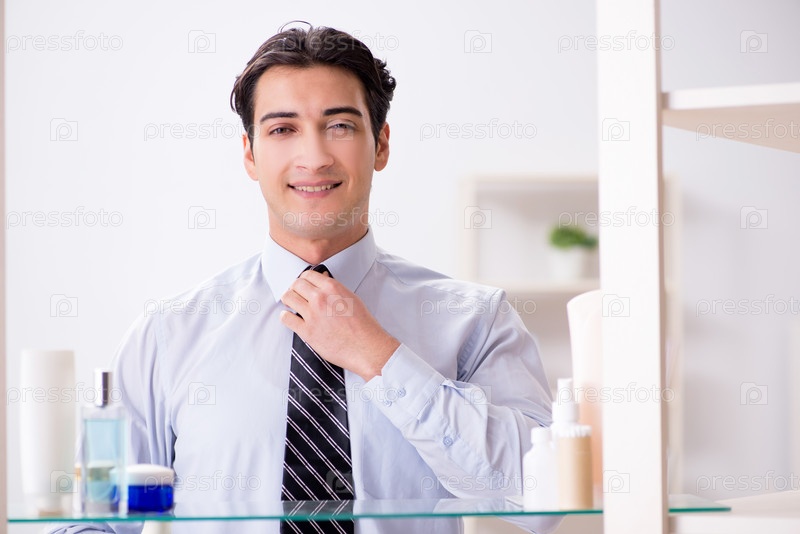 Мужчина одевается на работу в ванной