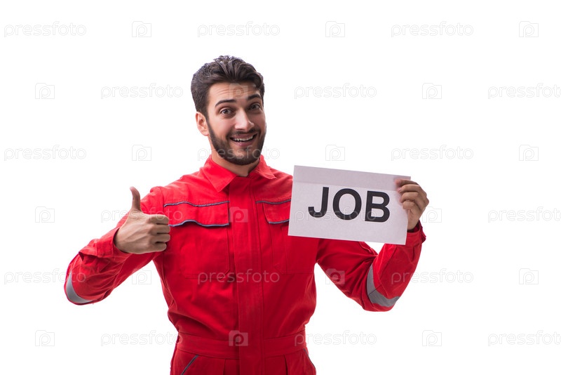 Мужчина в комбинезонах с посланием, изолированным на белом
