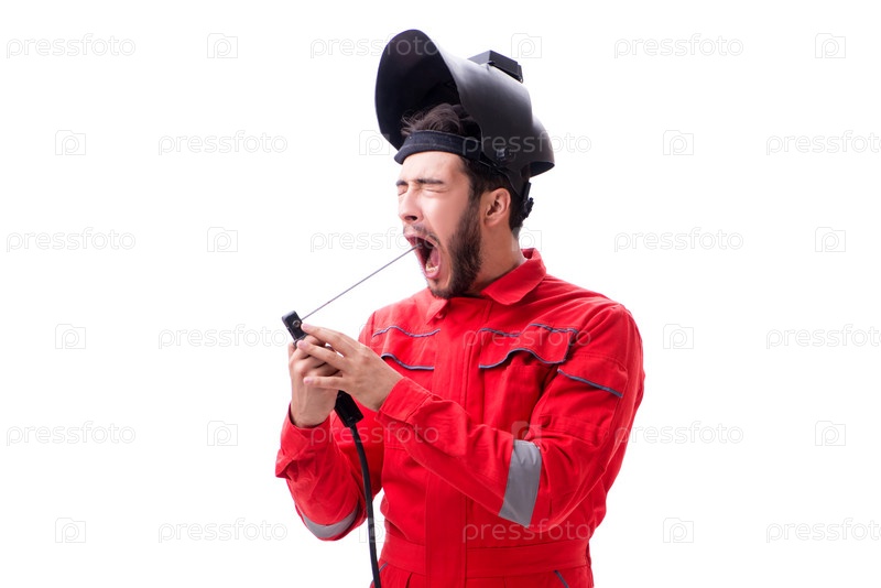 Забавный сварщик изолирован на белом фоне
