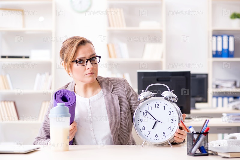 Женщина-сотрудник идет на занятия спортом с работы во время обеденного перерыва