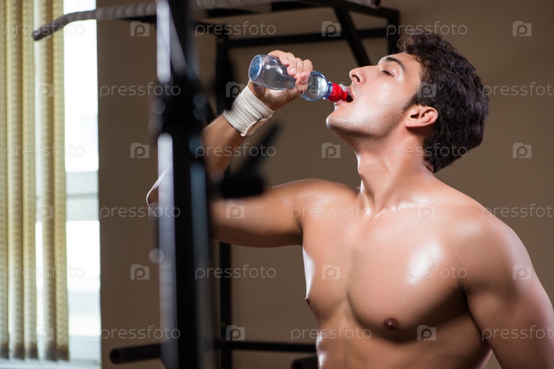 Жаждущий человек пьет воду в спортивном тренажерном зале