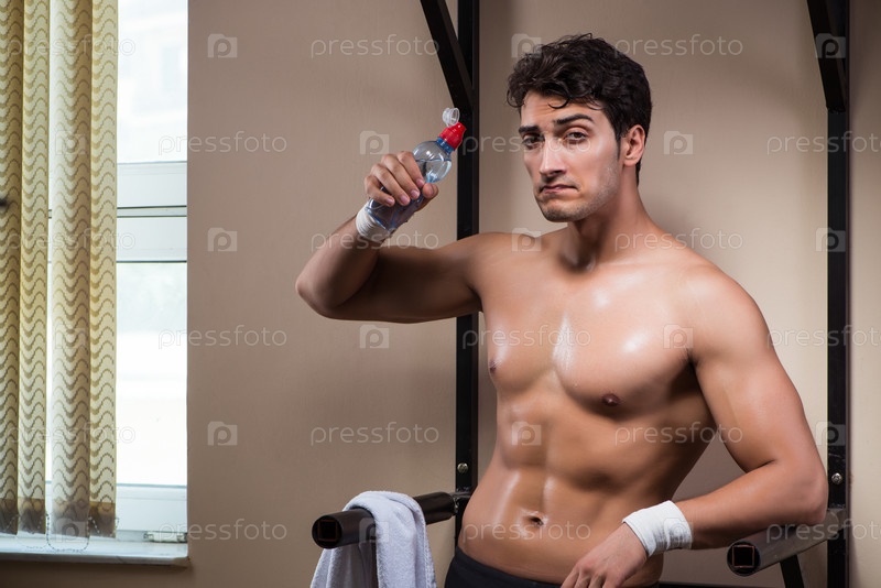 Жаждущий человек пьет воду в спортивном тренажерном зале