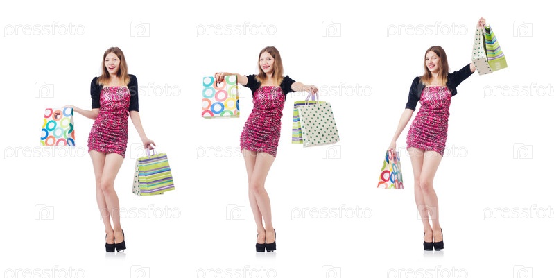 Молодая девушка после хороших покупок на белом