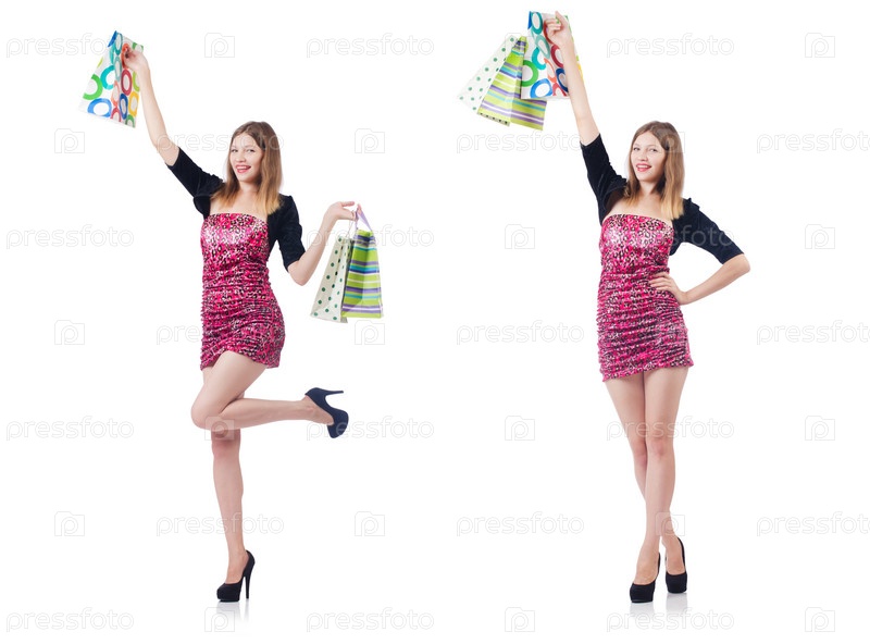 Молодая девушка после хороших покупок на белом