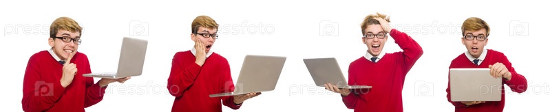 Студент, использующий ноутбук изолированный на белом