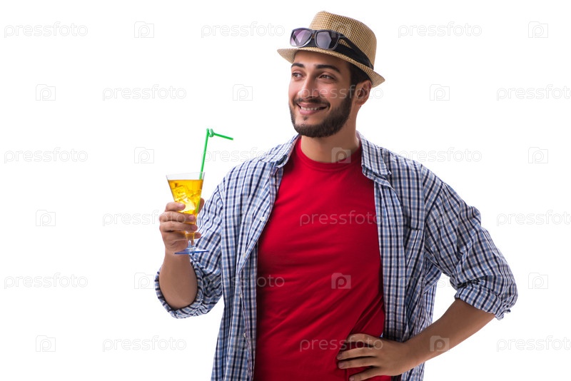 Юный смешной человек с коктейлем, изолированным на белом