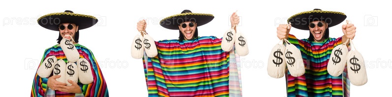 Красивый мужчина в ярком пончо, держащий сумки с деньгами изолированный на белом