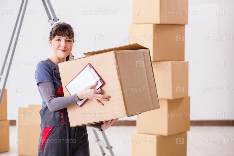 Женщина-подрядчик перемещает коробки в концепции переноса