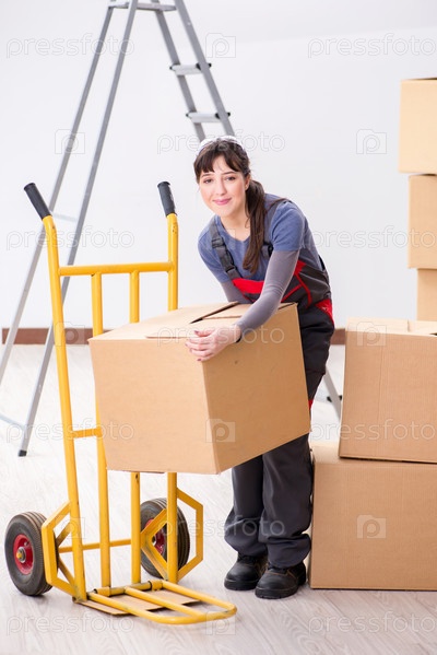 Женщина-подрядчик перемещает коробки в концепции переноса