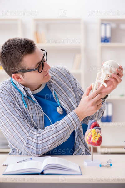 Студент-медик изучает скелет в классе во время лекции