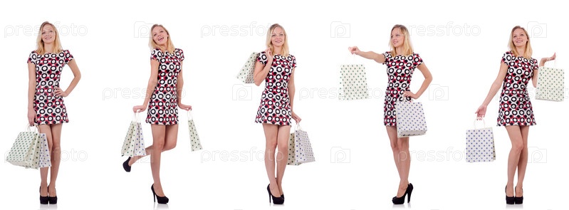 Молодая женщина с сумками для покупок на белом