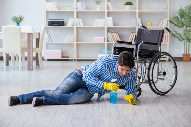 Инвалид на инвалидной коляске убирает дом