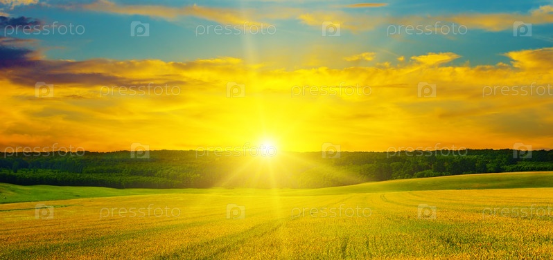 Пшеничное поле и восхитительный восход. Широкое фото