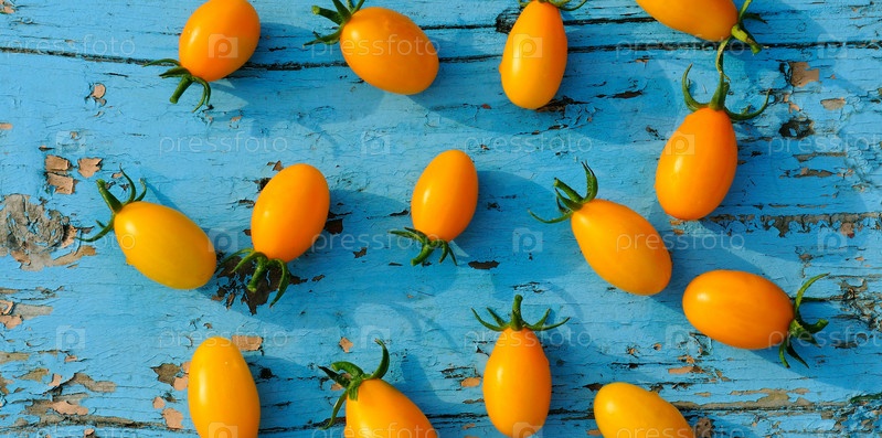 Желтые маленькие помидоры на синей деревянной поверхности