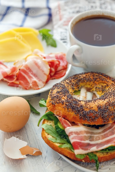 Бэйгел со салатами из руколы, огурцов и бекона на завтрак