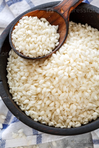 Белый круглый рис в деревянной миске
