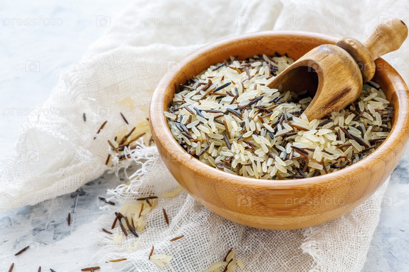 Смесь белого и дикого риса в деревянной таре