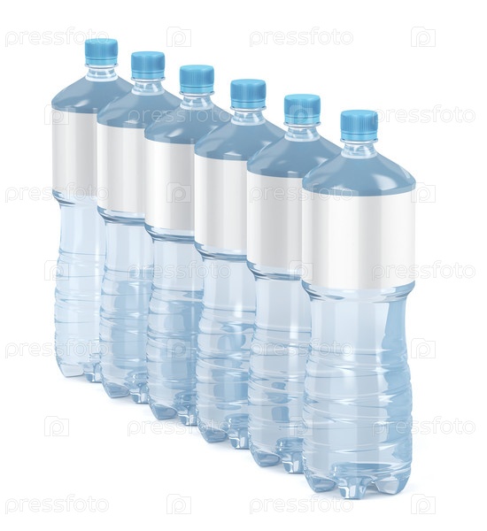 Шесть бутылок воды с пустыми этикетками