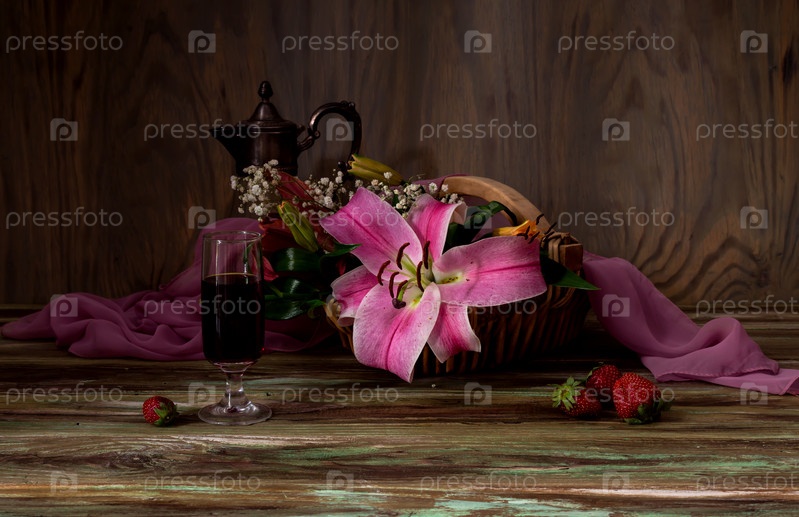 Букет из лилий, вино и клубника