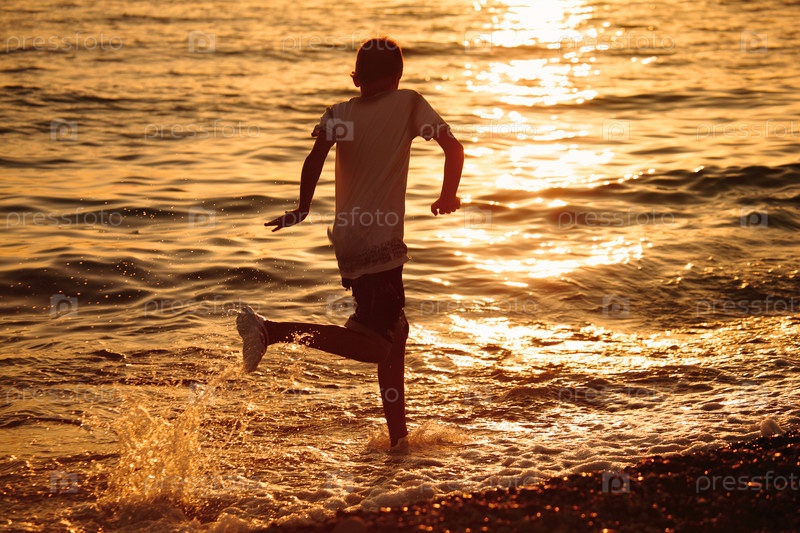 Силуэт бегущего по берегу мальчика