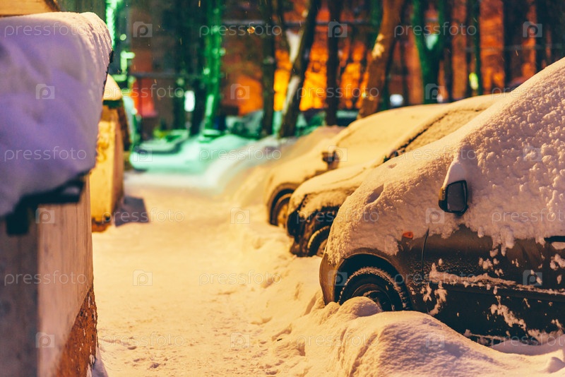 Машины стоят во дворе вечером, покрытые снегом
