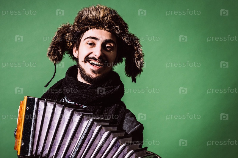 Очень позитивный человек с аккордеоном, позирующий в студии