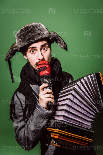 Очень позитивный человек с аккордеоном, позирующий в студии