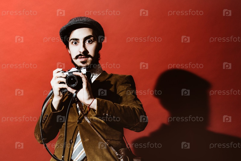 Очень позитивный фотограф, позирующий в студии с пленочной камерой