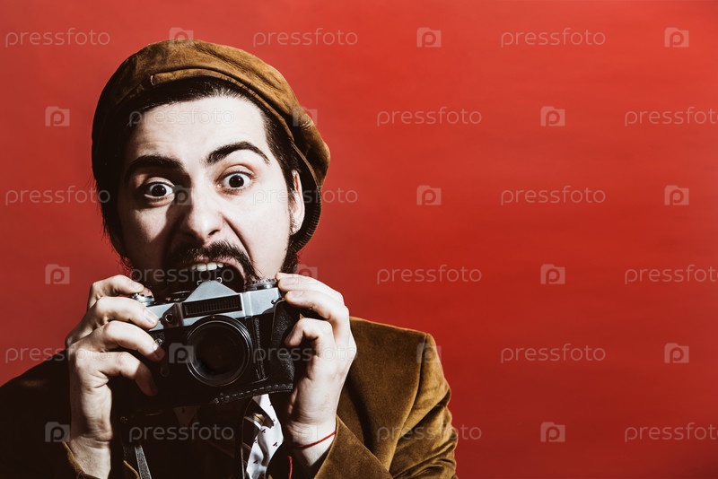 Очень позитивный фотограф, позирующий в студии с пленочной камерой