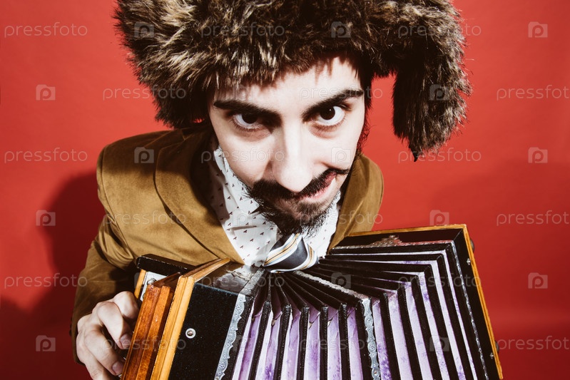 Очень позитивный человек с аккордеоном, позирующий в студии