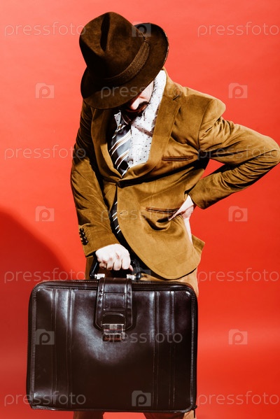 Мужчина позирует в студии с чемоданом в руках