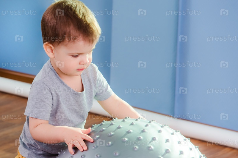 Маленький ребенок играет с фитболом в тренажерном зале