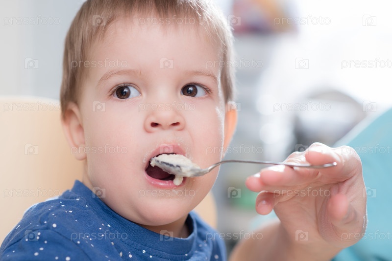 Мама кормит ребенка гречневой кашей на кухне