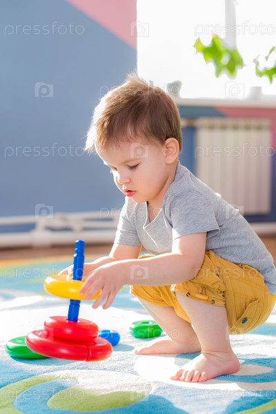 Маленький ребенок собирает пирамиду, сидящую на полу