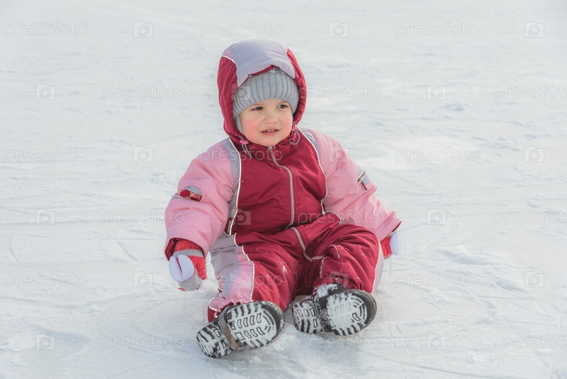 Маленький ребенок сидит на льду зимой