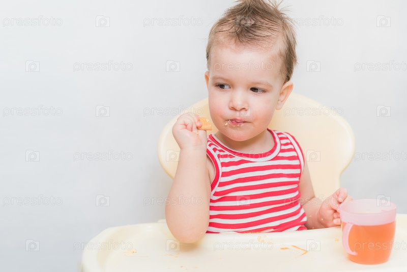 Маленький ребенок ест печенье и пьет компот на кухне