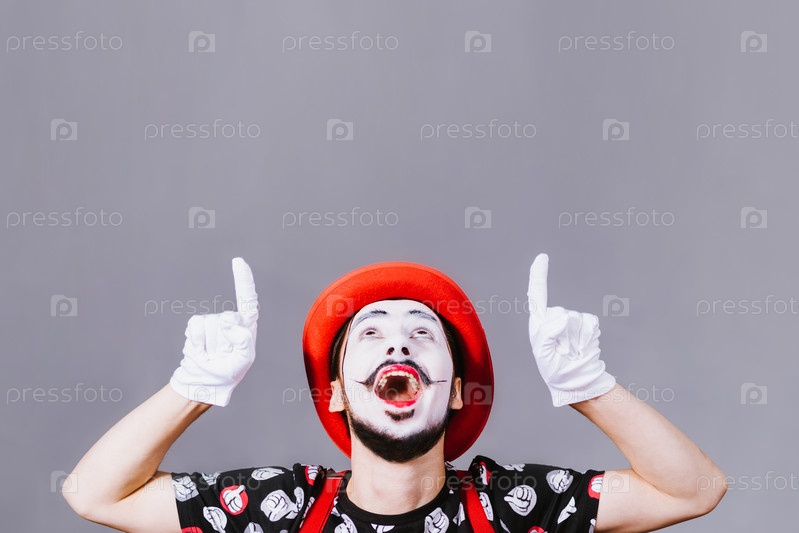 Забавный мим, позирующий возле серого фона