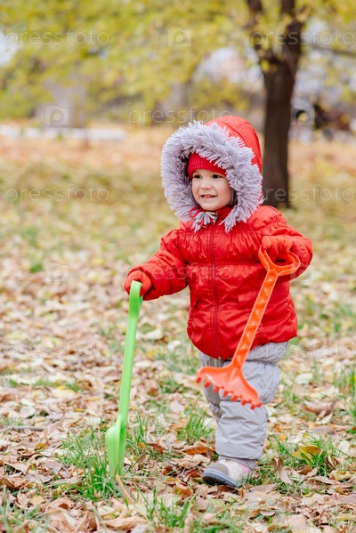 Маленький ребенок с грабежом и лопатой гуляет по парку