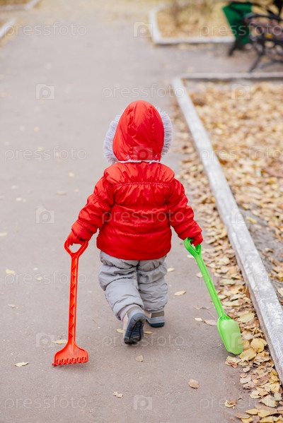 Маленький ребенок с грабежом и лопатой гуляет по парку