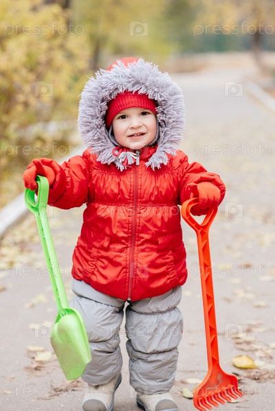 Маленький ребенок с грабежом и лопатой гуляет по парку