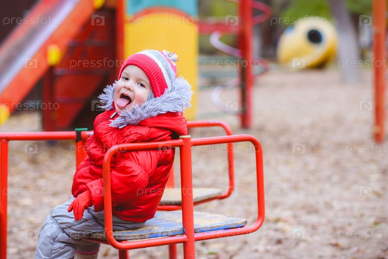 Ребенок вращается на качелях на игровой площадке в парке