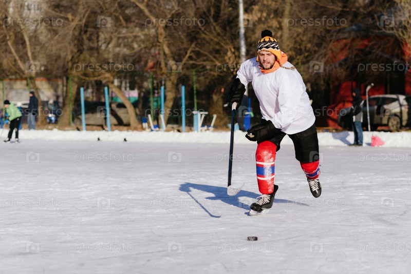 Мужчина играет в хоккей на катке