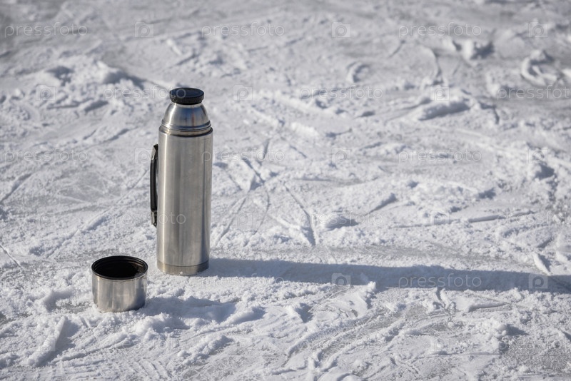 Термос стоит на льду с чашкой горячего чая