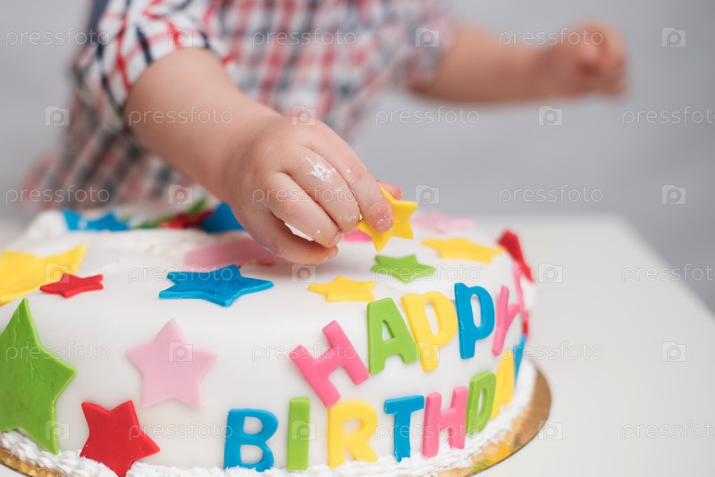 Маленький ребенок прикасается к торту, который лежит на столе