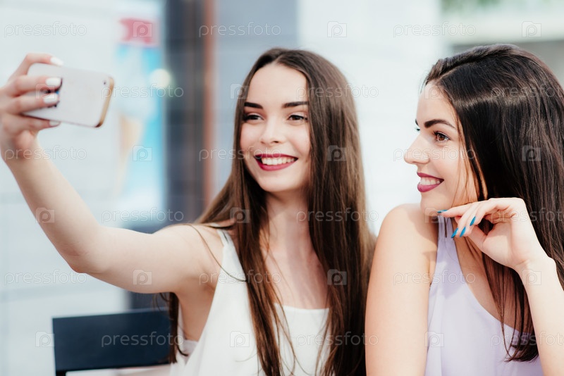 Девушки отдыхают за кофе и делают селфи