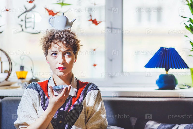 Красивая девушка пьет чай с чайником на голове