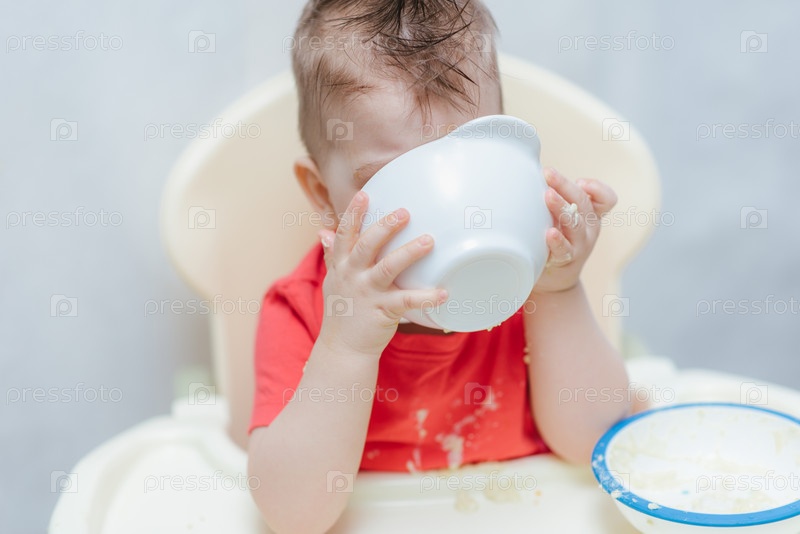 Милый мальчик съедает кашу маленькой ложкой сам