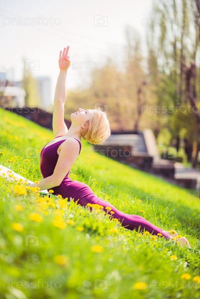 Девушка занимается йогой на зеленой траве в солнечный день